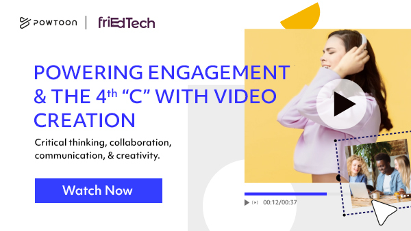 Powering Engagement and the 4th “C” with Video Creation Critical thinking, collaboration, communication, and creativity. The “4Cs” have... Powering Engagement and the 4th “C” with Video Creation Critical thinking, collaboration, communication, and creativity. The “4Cs” have become key identifiers of future-ready learning in K-12 education. Join Powtoon and friEdTech to take a look at how video creation elevates the learning in any classroom and helps students touch on each of the 4 Cs...