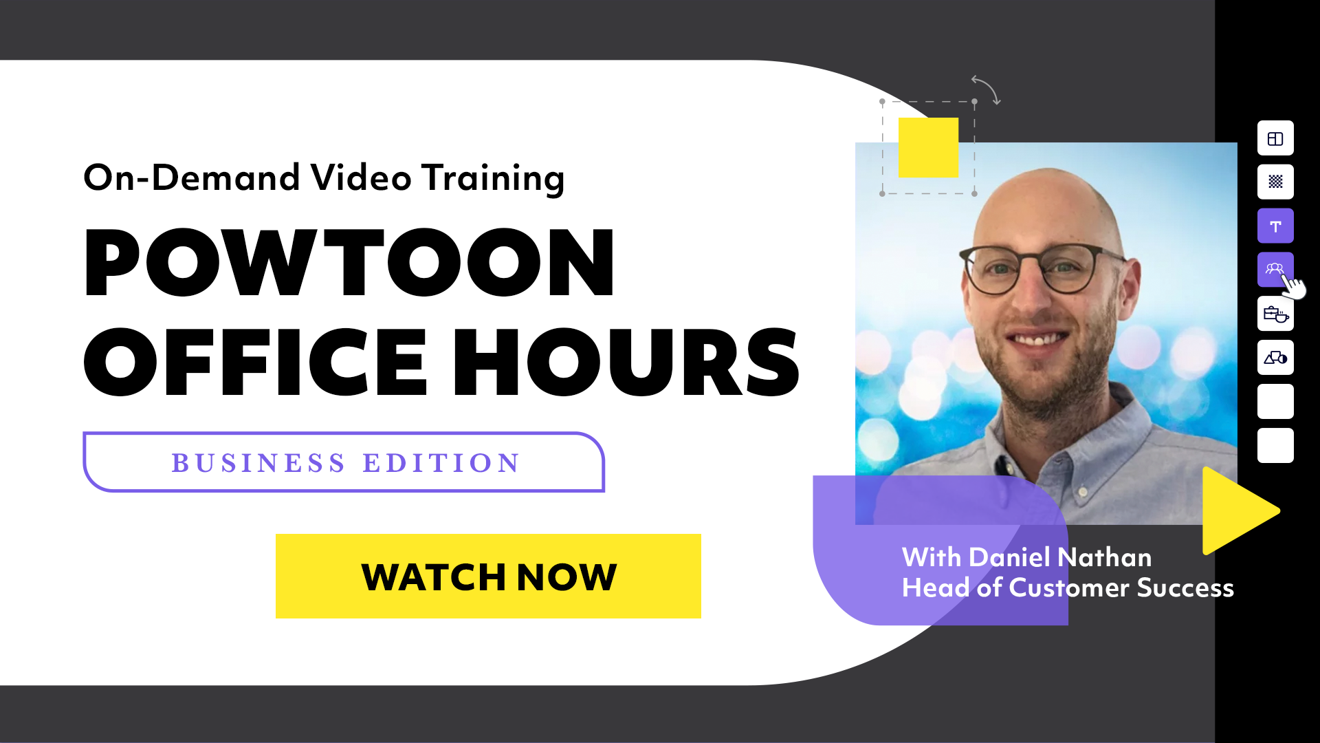 Powtoon Office Hours On-Demand Office Hours are informal live Q&A sessions with our Head of Customer Support, Daniel... Powtoon Office Hours On-Demand Office Hours are informal live Q&A sessions with our Head of Customer Support, Daniel Nathan. Get a chance to ask your questions directly to the Powtoon team. We hold LIVE sessions monthly, and you can always find the most recent on-demand replay below. Ready to join a live session? Click here...