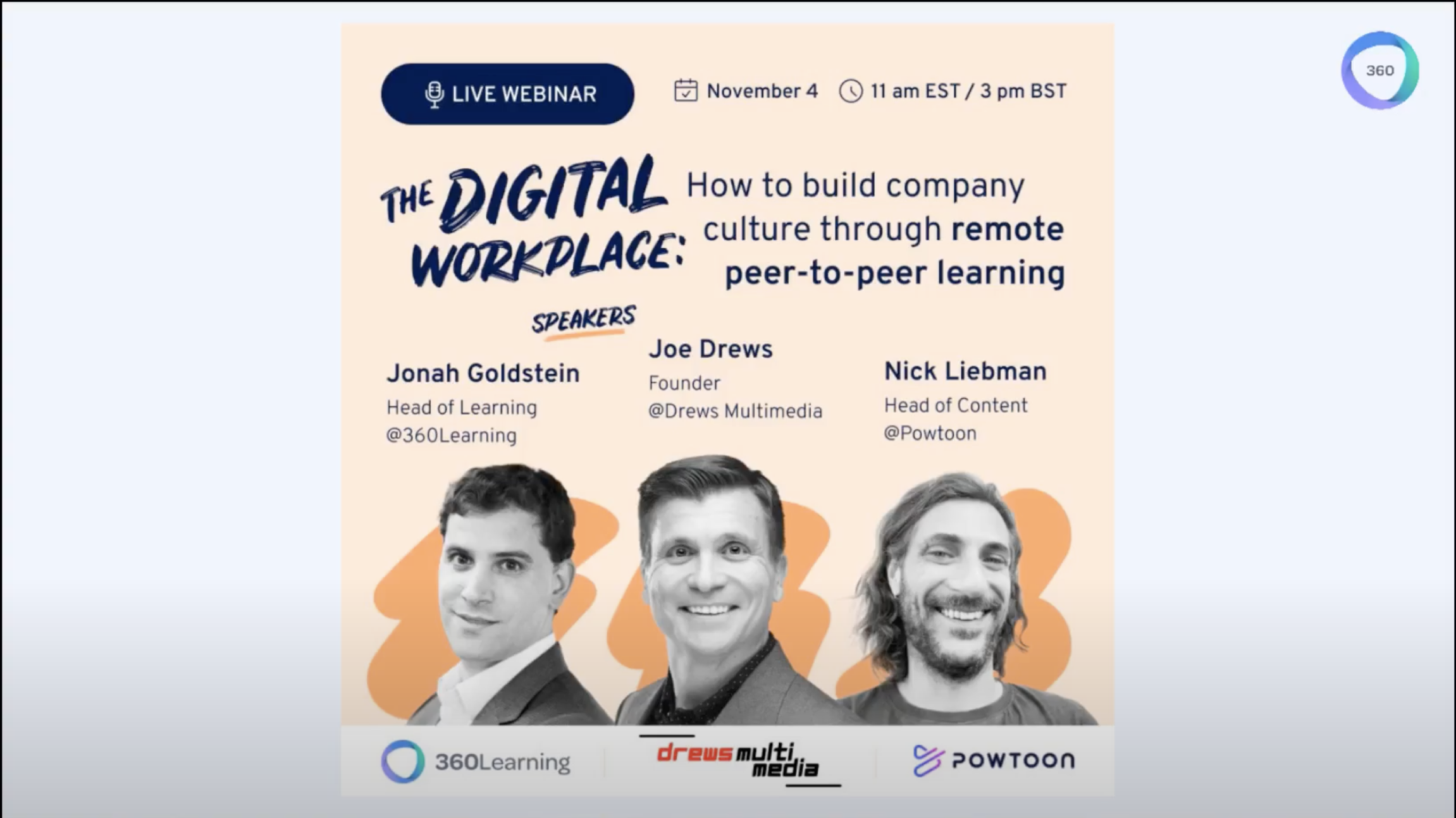 How to Build Company Culture Through Remote Peer-to-Peer Learning | Powtoon + 360Learning In this webinar, Powtoon’s head of content, Nick Liebman, joins ELearning expert,... How to Build Company Culture Through Remote Peer-to-Peer Learning | Powtoon + 360Learning In this webinar, Powtoon’s head of content, Nick Liebman, joins ELearning expert, Joe Drews, and head of learning for 360Learning, Jonah Goldstein, for a conversation about the power of video and peer-to-peer learning for building strong company culture in the age of the digital...