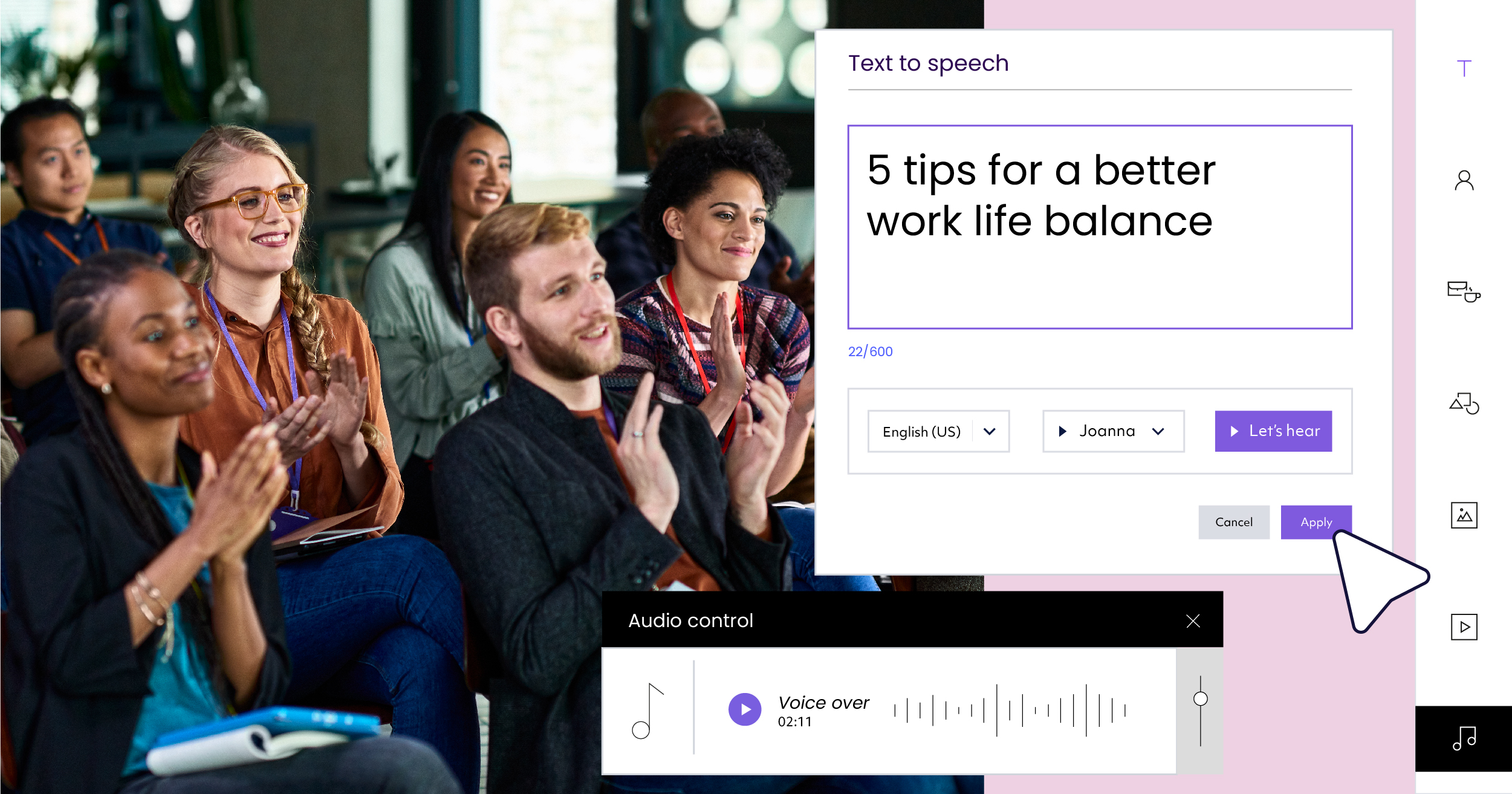 Those with vision difficulties may struggle to interpret videos without the help of audio descriptions and voiceovers. Audio descriptions are typically short recordings that provide a narrative account of video scenes and events, usually played during periods where there is no spoken dialogue occurring in the video. This provides more information about your video visuals and helps watchers understand your content even better. Voiceover is off-screen spoken audio and is added over the top of the video during or after the production process. It can be used to narrate your video or add additional information. With Powtoon Voiceover you can easily record or upload your own voiceover in the Powtoon Studio. Powtoons Text To Speech feature also allows you to literary turn your transcripts into a voiceover in minutes without having to record a thing! All you have to do is add or write up your script, select a language, and choose a voice. To top it off, Powtoon has three voiceover integrations such as Bunny Studios, Fiverr, and WellSaid, which allow for a seamless voiceover creation process.