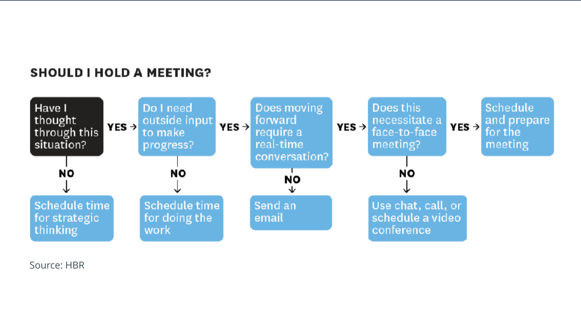 Even though you have all these options, there are still times when a meeting is absolutely essential. How do you decide when to ditch the meeting and when to hold it? Check out Harvard Business Review‘s flowchart: