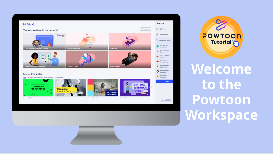The Workspace is your home base for all things Powtoon. Access all the Powtoons you’ve already created. Jump start your next visual communication masterpiece. Connect with learning resources. Take full advantage of all of Powtoon’s powerful integrations and apps.